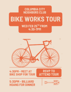 Bike Works is more than just a bike shop – find out how much more! Let’s meet outside of the bike shop (the yellow house!) at 4:30pm on Wednesday, February 25th, 2026. We will go for a little tour of the shop and then move to the Hudson Building to tour the office and warehouse space to learn about our neighborhood bike shop and how its ecosystem works through donations, youth and adult programs, and social and environmental justice.